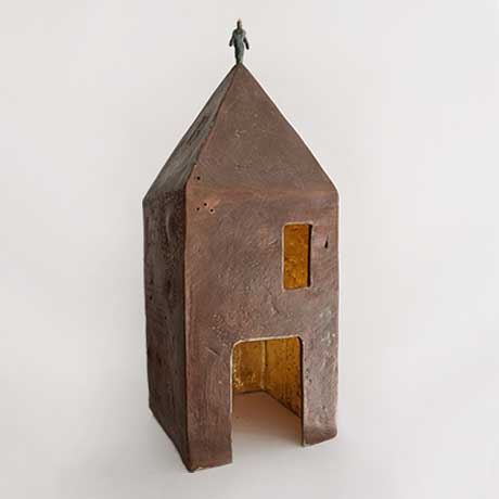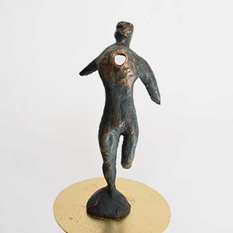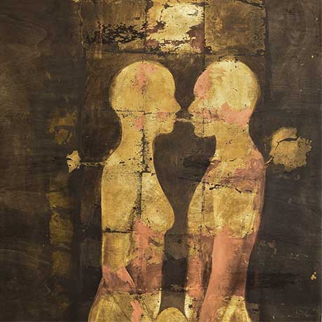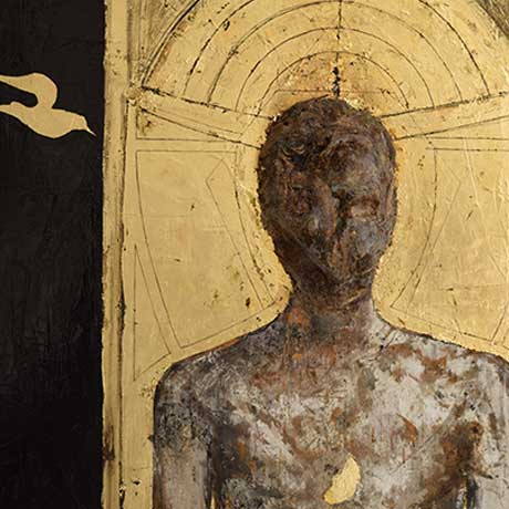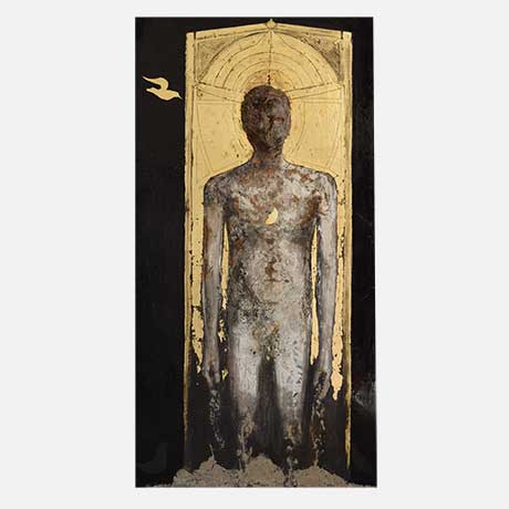 Pellegrino è colui che, errando, si allontana dal luogo di origine e si mette in cammino alla ricerca di quella luce primordiale. L’Uomo è un viandante: percorre la strada del ritorno fino ad un balsamico stato ontologico di assoluta armonia. Nel processo creativo lo fa abbandonandosi all’elemento intuitivo che lo guida a scorgere visioni spirituali chiare, lampanti come l’oro quando emerge dal nero. Seguire la direzione dello spazio creato dalla luce conduce a forme vitali la cui comprensione è preclusa al freddo intelletto.